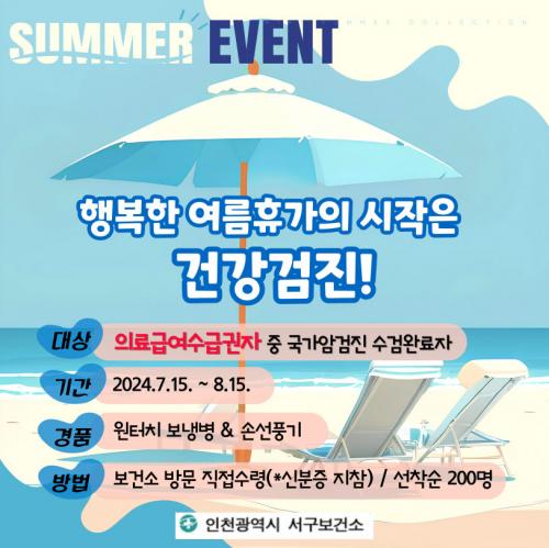 [½Åµ¿¾Æ¹æ¼Û ÀÎõ= À±¹Î½Ä±âÀÚ] ÀÎõ ¼­±¸º¸°Ç¼Ò(¼ÒÀå ÀåÁØ¿µ)´Â ¿©¸§ ÈÞ°¡Ã¶À» ¸Â¾Æ °Ç°­°ËÁøÀ» µ¶·ÁÇϰíÀÚ ÀÇ·á±Þ¿©¼ö±Þ±ÇÀÚ¸¦ ´ë»óÀ¸·Î À̺¥Æ®¸¦ ½Ç½ÃÇÑ´Ù°í ¹àÇû´Ù. ¡®ÇູÇÑ ¿©¸§ÈÞ°¡ÀÇ ½ÃÀÛÀº °Ç°­°ËÁø!¡¯À̶ó´Â ½½·Î°Ç ¾Æ·¡ ÁøÇàµÇ´Â À̹ø À̺¥Æ®´Â ±×µ¿¾È ¡¦