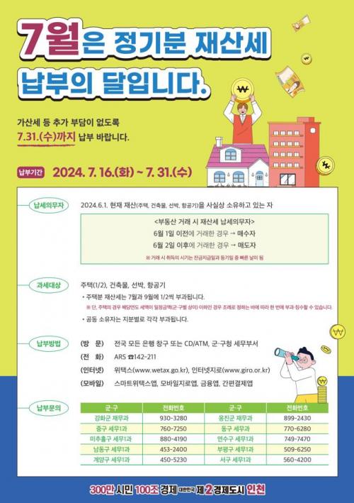 [½Åµ¿¾Æ¹æ¼Û ÀÎõ= À±¹Î½Ä±âÀÚ] ÀÎõ±¤¿ª½Ã´Â 2024³â 7¿ù Á¤±âºÐ Àç»ê¼¼(Áö¿ªÀÚ¿ø½Ã¼³¼¼, Áö¹æ±³À°¼¼ Æ÷ÇÔ) ¾à 16¸¸ °Ç, 3,994¾ï ¿øÀ» ºÎ°úÇß´Ù°í ¹àÇû´Ù. 7¿ù Á¤±âºÐ Àç»ê¼¼´Â 6¿ù 1ÀÏ ±âÁØ ÀÎõ¿¡ Àç»ê(ÁÖÅÃ, °ÇÃ๰, ¼±¹Ú, Ç×°ø±â)À» »ç½Ç»ó ¼ÒÀ¯Çϰí ÀÖ´Â ÀÚ¿¡¡¦