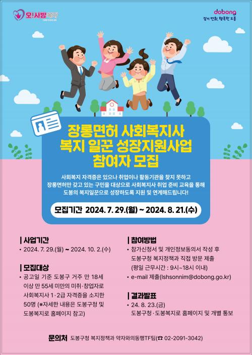 [½Åµ¿¾Æ¹æ¼Û=À̽ŵ¿±âÀÚ]µµºÀ±¸(±¸Ã»Àå ¿À¾ð¼®)°¡ »çȸº¹Áö»ç Àü¹®ÀÚ°ÝÁõÀ» ÃëµæÇÏ°íµµ Àå·Õ¸éÇã·Î ¹¬ÇôµÎ°í ÀÖ´Â ±¸¹ÎÀÇ »çȸ ÁøÃâÀ» µ½±â À§ÇØ ³ª¼¹´Ù. ±¸´Â ¿À´Â 8¿ù 21ÀϱîÁö '2024 Àå·Õ¸éÇã »çȸº¹Áö»ç ¼ºÀå Áö¿ø»ç¾÷' Âü¿©ÀÚ¸¦ ¸ðÁýÇÑ´Ù°í ¹àÇû´Ù. º» »ç¾÷Àº¡¦