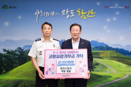 [½Åµ¿¾Æ¹æ¼Û=À̽ŵ¿±âÀÚ] ÇԾȱºÀº 8ÀÏ ÇԾȼҹ漭 Á÷¿øµéÀÌ °íÇâ»ç¶û±âºÎ±Ý 765¸¸ ¿øÀ» ±âŹÇß´Ù°í ¹àÇû´Ù. ÇԾȼҹ漭ÀÇ À̹ø °íÇâ»ç¶û±âºÎ´Â ÃÖ°æ¹ü ¼­ÀåÀ» ºñ·ÔÇØ Á÷¿ø 77¸íÀÇ ÀÚ¹ßÀû µ¿ÂüÀ¸·Î ÀÌ·ïÁ³´Ù. À̳¯ ±âºÎ½Ä¿¡¼­ ÃÖ°æ¹ü ¼­ÀåÀº ¡°ÇԾȼҹ漭 Á÷¿øµéÀÌ ¡¦