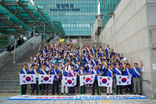 [½Åµ¿¾Æ¹æ¼Û=À̽ŵ¿±âÀÚ] ¹Ù¸£°Ô»ì±â¿îµ¿ µ¿´ë¹®±¸ÇùÀÇȸ(ȸÀå À¯°­½Ä)°¡ Á¦79Áֳ⠱¤º¹ÀýÀ» ¸Â¾Æ 14ÀÏ Ã»·®¸®¿ª ±¤Àå¿¡¼­ ³ª¶ó»ç¶û űر⠴ޱâ Ä·ÆäÀÎÀ» ½Ç½ÃÇß´Ù. Ä·ÆäÀο¡ Âü¿©ÇÑ ¹Ù¸£°Ô»ì±â¿îµ¿ ȸ¿ø 100¿© ¸íÀº û·®¸®¿ªÀ» ¿À°¡´Â Áֹε鿡°Ô űرⰡ ±×·ÁÁø ¡¦