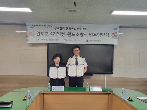 [½Åµ¿¾Æ¹æ¼Û=À̽ŵ¿±âÀÚ]Àü¶ó³²µµ¿Ïµµ±³À°Áö¿øÃ»(±³À°Àå ±èÁ¤¼±)Àº 8¿ù 21ÀÏ(¼ö) ¿Ïµµ±³À°Áö¿øÃ» ¼ÒȸÀǽǿ¡¼­ ¿Ïµµ¼Ò¹æ¼­¿ÍÀÇ ¾÷¹«Çù¾àÀ» ü°áÇß´Ù. À̹ø¡°¿Ïµµ±³À°Áö¿øÃ»-¿Ïµµ¼Ò¹æ¼­ °£ ¾÷¹«Çù¾à¡±Àº Çлý°ú ±³Á÷¿øÀÇ ¾ÈÀüÀÇ½Ä °íÃë¿Í Àç³­ ¹× ¾ÈÀü»ç°í ´ëÀÀ´É·Â¡¦