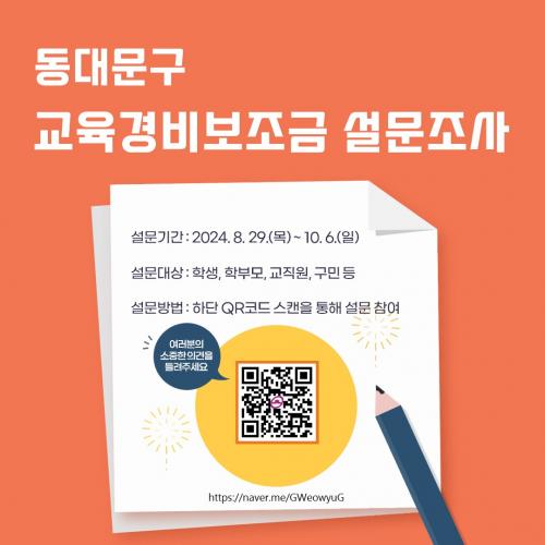 [½Åµ¿¾Æ¹æ¼Û=À̽ŵ¿±âÀÚ] µ¿´ë¹®±¸(±¸Ã»Àå ÀÌÇÊÇü)´Â Çлý°ú Çкθ𸦠ºñ·ÔÇÑ Áö¿ª ÁֹΠ¸ðµÎ°¡ ü°¨ÇÒ ¼ö ÀÖ´Â ±³À°È¯°æ °³¼±À» À§ÇØ 10¿ù 6ÀϱîÁö ¡®2025³â ±³À°°æºñº¸Á¶±Ý Áö¿ø°èȹ ¼ö¸³À» À§ÇÑ ¼³¹®Á¶»ç¡¯¸¦ ÁøÇàÇÑ´Ù. µ¿´ë¹®±¸´Â ÀÚÄ¡±¸ Áß ÃÖ»óÀ§ ¼öÁØÀÎ 120¡¦