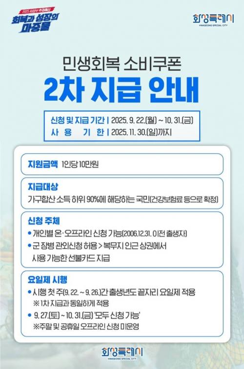 [½Åµ¿¾Æ¹æ¼Û=ÀÌÀçö±âÀÚ] È­¼ºÆ¯·Ê½Ã(½ÃÀå Á¤¸í±Ù)°¡ ¹Î»ýȸº¹ ¼ÒºñÄíÆù 1Â÷ Áö±Þ·ü 99.2%·Î Àü±¹ Ư·Ê½Ã Áß 1À§¸¦ ´Þ¼ºÇÑ µ¥ À̾î, 22ÀϺÎÅÍ 2Â÷ Áö±ÞÀ¸·Î ¹Î»ýȸº¹ °¡¼Ó¿¡ ³ª¼¹´Ù. À̹ø 2Â÷ ¼ÒºñÄíÆùÀº ¼Òµæ ÇÏÀ§ 90%¿¡ ÇØ´çÇÏ´Â È­¼º½Ã¹Î 83¸¸ 9,002¸íÀ» ´ë»óÀ¸·Î¡¦