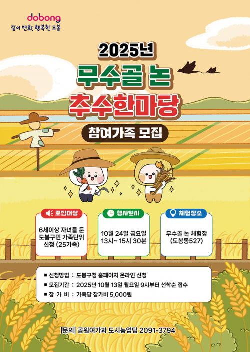 [½Åµ¿¾Æ¹æ¼Û µµºÀ±¸=À̽ŵ¿±âÀÚ] ¼­¿ï µµºÀ±¸°¡ ¿À´Â 10¿ù 24ÀÏ ¹«¼ö°ñ ģȯ°æ ³í üÇèÀå(µµºÀµ¿ 527)¿¡¼­ ¡®¹«¼ö°ñ ³í Ãß¼öÇѸ¶´ç¡¯ Çà»ç¸¦ °³ÃÖÇÑ´Ù. Çà»ç¿¡¼­ Âü¿©ÀÚµéÀº º­ ¼öÈ®ºÎÅÍ Å»°î, µµÁ¤±îÁö ÀüÅë º­³ó»ç °úÁ¤À» Á÷Á¢ üÇèÇØ º¼ ¼ö ÀÖ´Ù. ´çÀÏ º²Â¤À» ¡¦