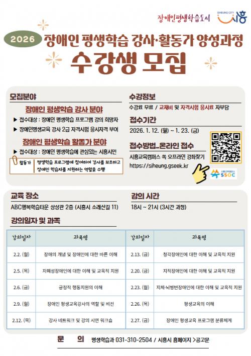 [½Åµ¿¾Æ¹æ¼Û ½ÃÈï½Ã=À̽ŵ¿±âÀÚ] ½ÃÈï½Ã´Â ¿À´Â 1¿ù 23ÀϱîÁö ¡®2026³â Àå¾ÖÀÎ Æò»ýÇнÀ Àü¹® °­»ç¿Í Ȱµ¿°¡ ¾ç¼º °úÁ¤¡¯ ¼ö°­»ýÀ» ¸ðÁýÇÑ´Ù. À̹ø °úÁ¤Àº Àå¾ÖÀÎ Æò»ýÇнÀ ÇöÀåÀÇ Àü¹®¼ºÀ» ³ôÀ̰í, Àå¾Ö À¯Çü°ú ÇнÀ Ư¼ºÀ» °í·ÁÇÑ ¸ÂÃãÇü ÇнÀ ¼­ºñ½º¸¦ Á¦°øÇÒ ÀΡ¦