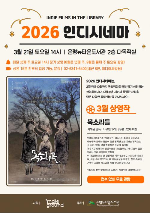 [½Åµ¿¾Æ¹æ¼Û ÀºÆò±¸=À̽ŵ¿±âÀÚ] ¼­¿ï ÀºÆò±¸´Â ¿À´Â 21ÀϺÎÅÍ ±¸¸³ ÀºÆò´ºÅ¸¿îµµ¼­°ü¿¡¼­ µ¶¸³¿µÈ­ Á¤±â »ó¿µ ÇÁ·Î±×·¥ ¡®2026 Àεð½Ã³×¸¶¡¯¸¦ ¿î¿µÇÑ´Ù°í ¹àÇû´Ù. ¡®2026 Àεð½Ã³×¸¶¡¯´Â ¿µÈ­ÁøÈïÀ§¿øÈ¸ µ¶¸³¿µÈ­ À¯Å롤¹è±Þ Áö¿ø Ç÷§Æû ¡®Àεð±×¶ó¿îµå¡¯ÀÇ Áö¿øÀ»¡¦
