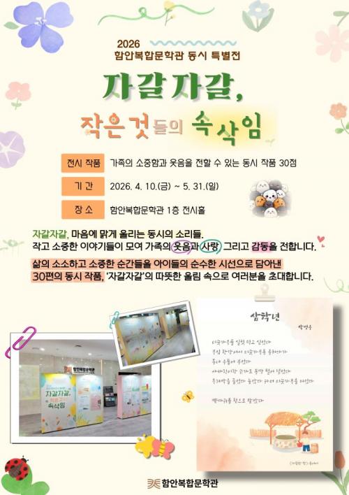 [½Åµ¿¾Æ¹æ¼Û °æ³²ÇÔ¾È=À̽ŵ¿±âÀÚ] ÇԾȱºÀº 5¿ù °¡Á¤ÀÇ ´ÞÀ» ¸Â¾Æ 4¿ù 10ÀϺÎÅÍ 5¿ù 31ÀϱîÁö ÇԾȺ¹ÇÕ¹®Çаü 1Ãþ Àü½ÃȦ¿¡¼­ º½ÀÇ Á¤Ã븦 ´àÀº µ¿½Ã Ưº°Àü ¡®ÀÚ°¥ÀÚ°¥, ÀÛÀº °ÍµéÀÇ ¼Ó»èÀÓ¡¯À» °³ÃÖÇÑ´Ù°í ¹àÇû´Ù. À̹ø Àü½Ã´Â ÀÏ»ó ¼Ó ÀÛ°í ¼ÒÁßÇÑ ¼ø°£µéÀ» µ¿½Ã¡¦